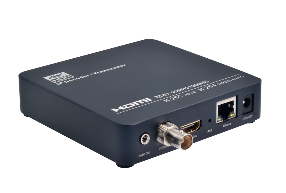 E1026-J解码器是一款专业的超高清音视频解码产品,该产品具有1路HDMI音视频输出接口,1路3.5mm立体声音频输出,1路CVBS视频输出,支持H.265/H.264解码格式。接收来自于编码器的TS流等标准的流协议,可根据不同需要设置输出视频的分辨率,且可将该流进行转码及rtmp推流到直播平台的功能,该设备具有高集成,低成本,传输延时小(典型条件下,延时在300ms)的优势,可广泛应用于各种多媒体发布,数字标牌,信号发布等高清视频系统中。